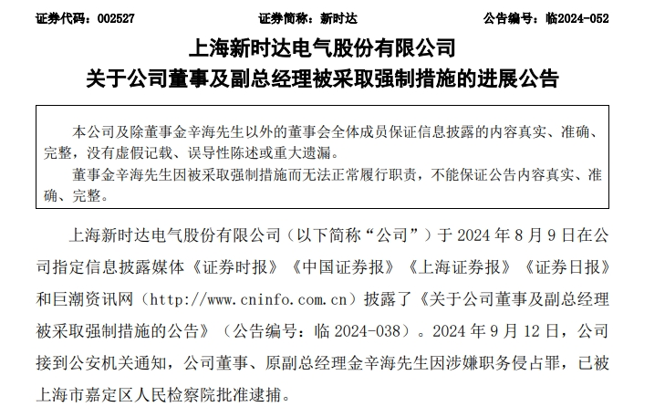 新时达(002527.SZ,股价5.89元,市值39.05亿元)9月13日公告,2024年9月12日,公司接到公安机关通知,公司董事、原副总经理金辛海因涉嫌职务侵占罪网上股票配资怎么样,已被上海市嘉定区人民检察院批准逮捕。