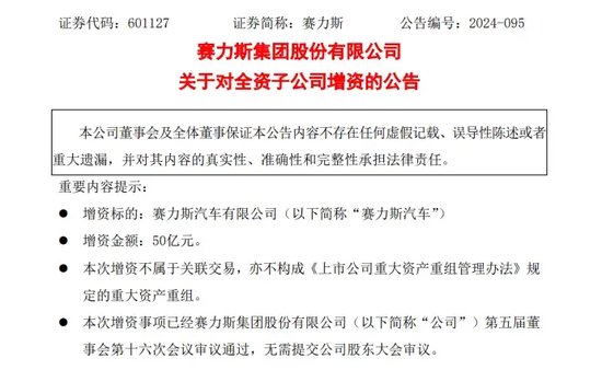 公告显示,为增强赛力斯汽车的资本实力,满足其可持续高质量发展需要,赛力斯拟以自有资金向赛力斯汽车增资50亿元,完成增资后,赛力斯汽车的注册资本为99.6亿元,仍为公司全资子公司。