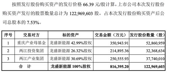 按照发行股份购买资产的发行价格66.39元/股计算,上市公司本次发行股份购买资产发行的股票数量总计为1.23亿股,占本次发行股份购买资产后公司总股本的 7.53%。上市公司就购买标的资产应向重庆产业母基金、两江投资集团、两江产业集团支付的对价股份的数量分别为5286.1万股、3236.86万股和3774万股。发行数量最终以中国证监会同意注册的数量为准。