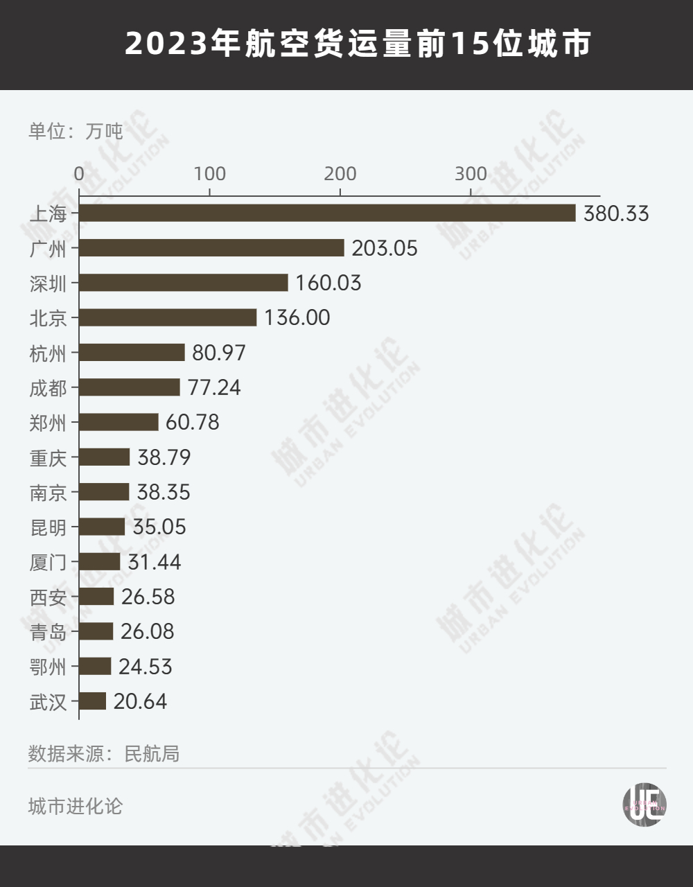 尽管如此,2023年杭州仍维持了航空货运量第五的位置,前四分别是上海、广州、深圳、北京。在杭州之后,成都位列第六、郑州位列第七,鄂州在2023年排在第14位。